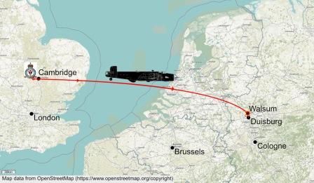 Map shows the plane’s path from England towards Duisburg. It was shot down by German flak and crashed in Walsum, 11 km north northwest of its target of Duisburg. (Map prepared by Wendy Nattress)