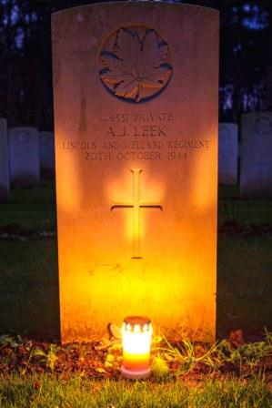Grave of Albert John Leek in the Canadian War Cemetery in Bergen Op Zoom, The Netherlands with a Christmas Eve candle. (Photo courtesy of Caroline Raaijmakers)