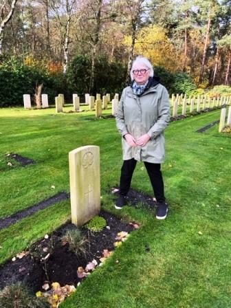 Barbara Sullivan at the grave of her uncle, James Sullivan, buried in the Canadian War Cemetery in Holten, The Netherlands. (Photo courtesy of Barbara Sullivan)