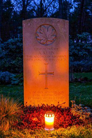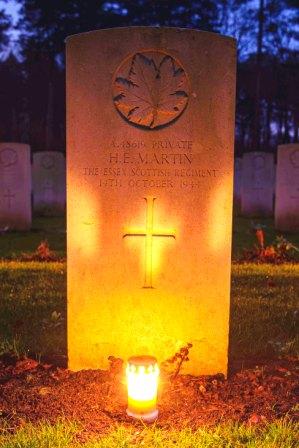 This year, we include photos of the candlelit graves for 8 soldiers – that Pieter has researched and whose stories have been previously told – who are buried in the Canadian War Cemetery in Bergen Op Zoom, The Netherlands. This cemetery began the tradition of lighting candles on Christmas Eve in 1991, with candles placed by many volunteers.