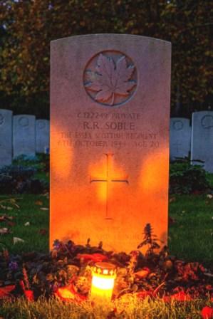 WWII soldier Russell Richard SOBLE, born in Ameliasburg, Ontario, was serving with the Essex Scottish Regiment when he died on October 6, 1944, aged 20, one of 12 members of the regiment killed in action in Putte, a town on the Dutch-Belgian border, in a fight on October 5, 1944 that marked the beginning of the Battle of the Scheldt. (See https://onthewarmemorialtrail.com/2021/01/13/on-the-war-memorial-trail-atlantic-canada-remembers-part-2/)