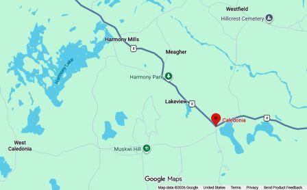 Caledonia, located in Queens County, Nova Scotia is 151 kms (94 miles) from Halifax. (Map source: Google maps)
