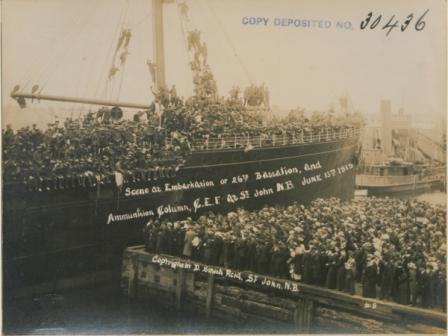 Scene at embarkation of 26th Battalion and ammunition column CEF, St. John, New Brunswick, June 13, 1915. No. 9.  (Photo source: D. Smith Reid, Public domain, via Wikimedia Commons)
