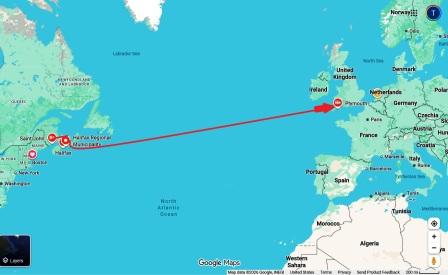 The ‘Caledonia’ travelled from Saint John, New Brunswick to Halifax, Nova Scotia, and then across the Atlantic Ocean to Plymouth, England.  (Map source: Google maps)