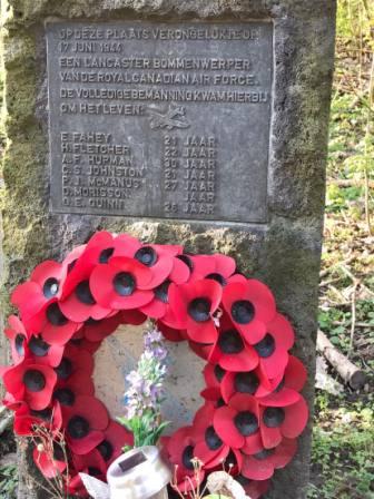 Memorial plaque for the crew of Lancaster X KB728 in Elden, The Netherlands. (Photo source: Facebook RAF Bomber Command Memorials, photo taken by Chris de Vries)
