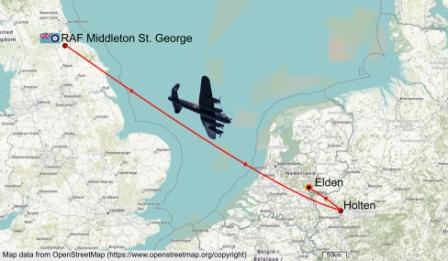 Map shows the plane’s path from Middleton St. George to Holten, Germany and then to where it crashed in Elden, The Netherlands. (Map prepared by Wendy Nattress)