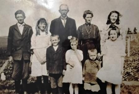 Front row, left to right: JP, Martina, Dave, Bernadette. Back row, left to right: Matthew, Agnes, John Thomas, Janie Josephine, Mary Catherine. (Photo courtesy of Alice Cash Blakeney and Estate of Bernadette White Adler)